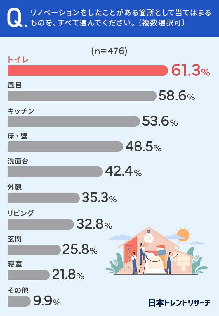 ■リノベーションをしたことがある場所は「トイレ」が61.3%で最多に