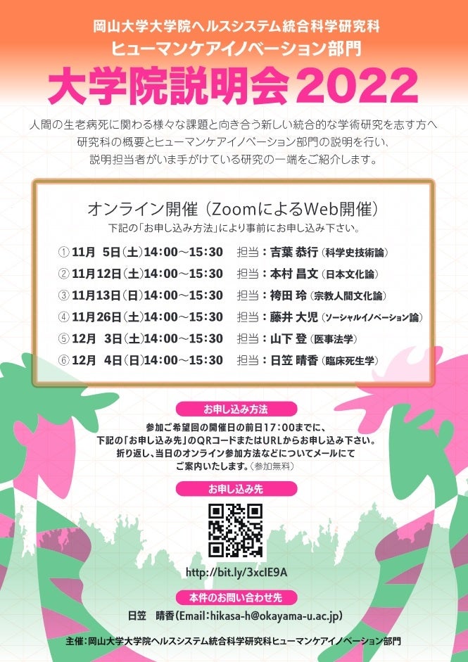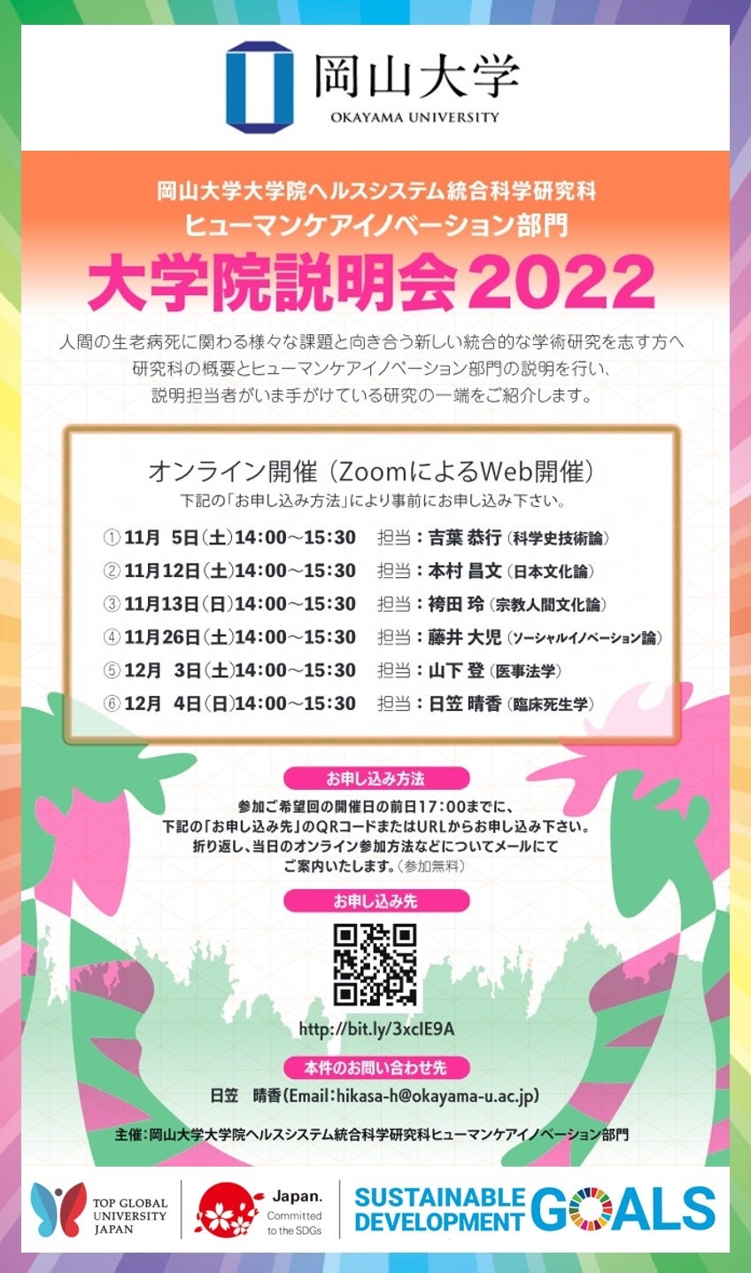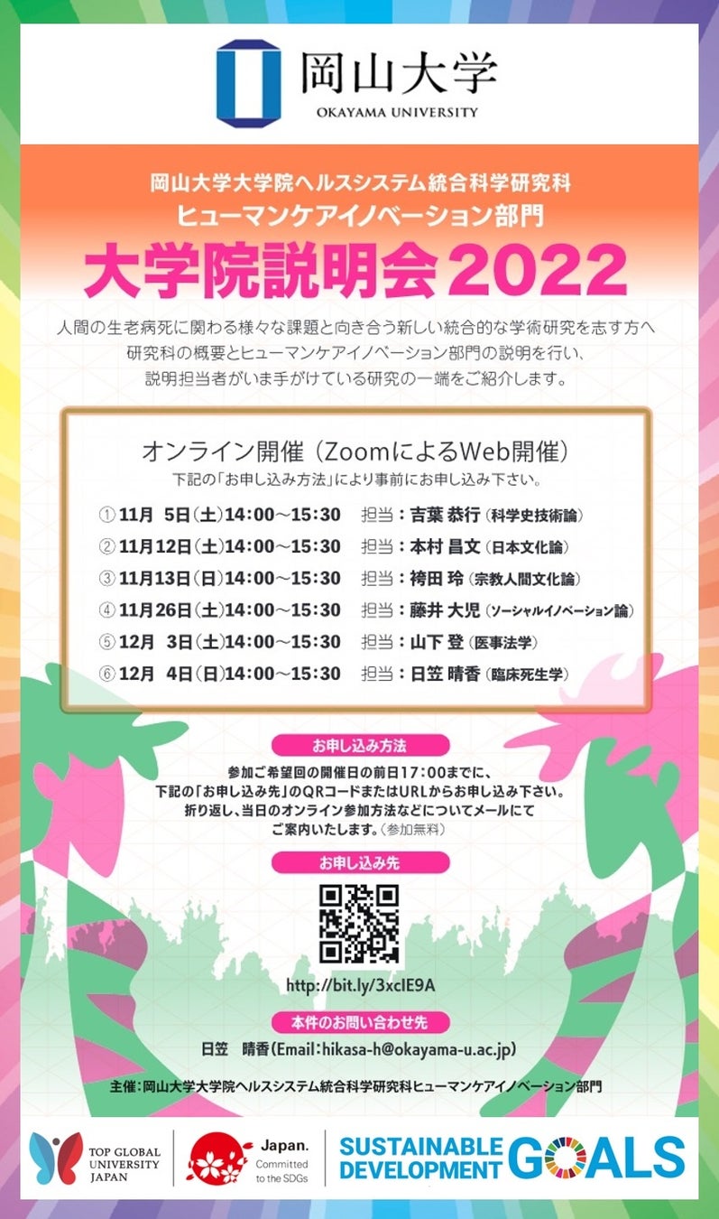 【岡山大学】岡山大学大学院ヘルスシステム統合科学研究科「ヒューマンケアイノベーション部門」大学院説明会2022〔オンライン〕