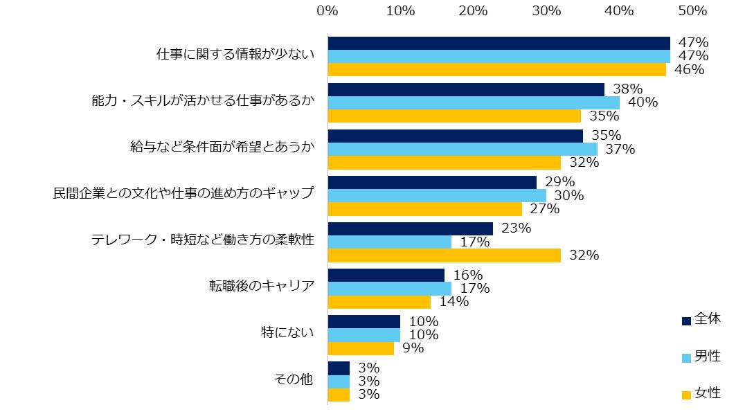 官公庁・自治体への転職を考えた際の、不明な点・不安な点を伺うと、トップは「仕事に関する情報が少ない」(47%)でした。次いで、「能力・スキルが活かせる仕事があるか」(38%)、「給与など条件面が希望とあうか」(35%)が続きます。男女別では、「テレワーク・時短など働き方の柔軟性」(男性:17%、女性:32%)で15ポイントの差がひらきました。不明・不安に感じる具体的な理由についても紹介します。