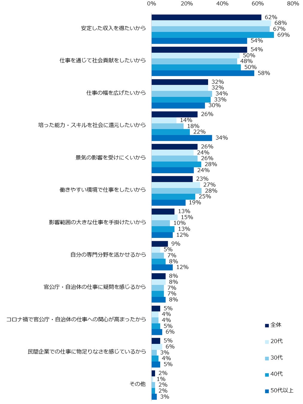 ★ 62%が「官公庁・自治体への転職に興味がある」と回答。興味をもつ理由の上位は「安定した収入」「仕事を通じた社会貢献」。