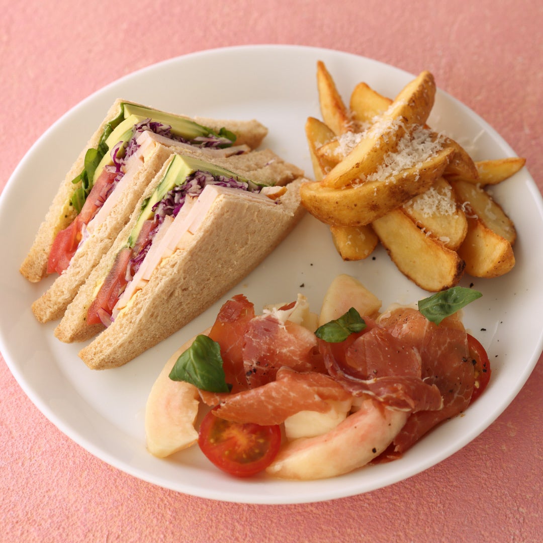 上品な桃の甘さと生ハムの塩味が絶妙な「白桃のカプレーゼ」や柔らかく味わい深い伊達鶏を挟んだ「スモークした伊達鶏とアボカドのサンド」など、レストランならではのセイボリーも充実。