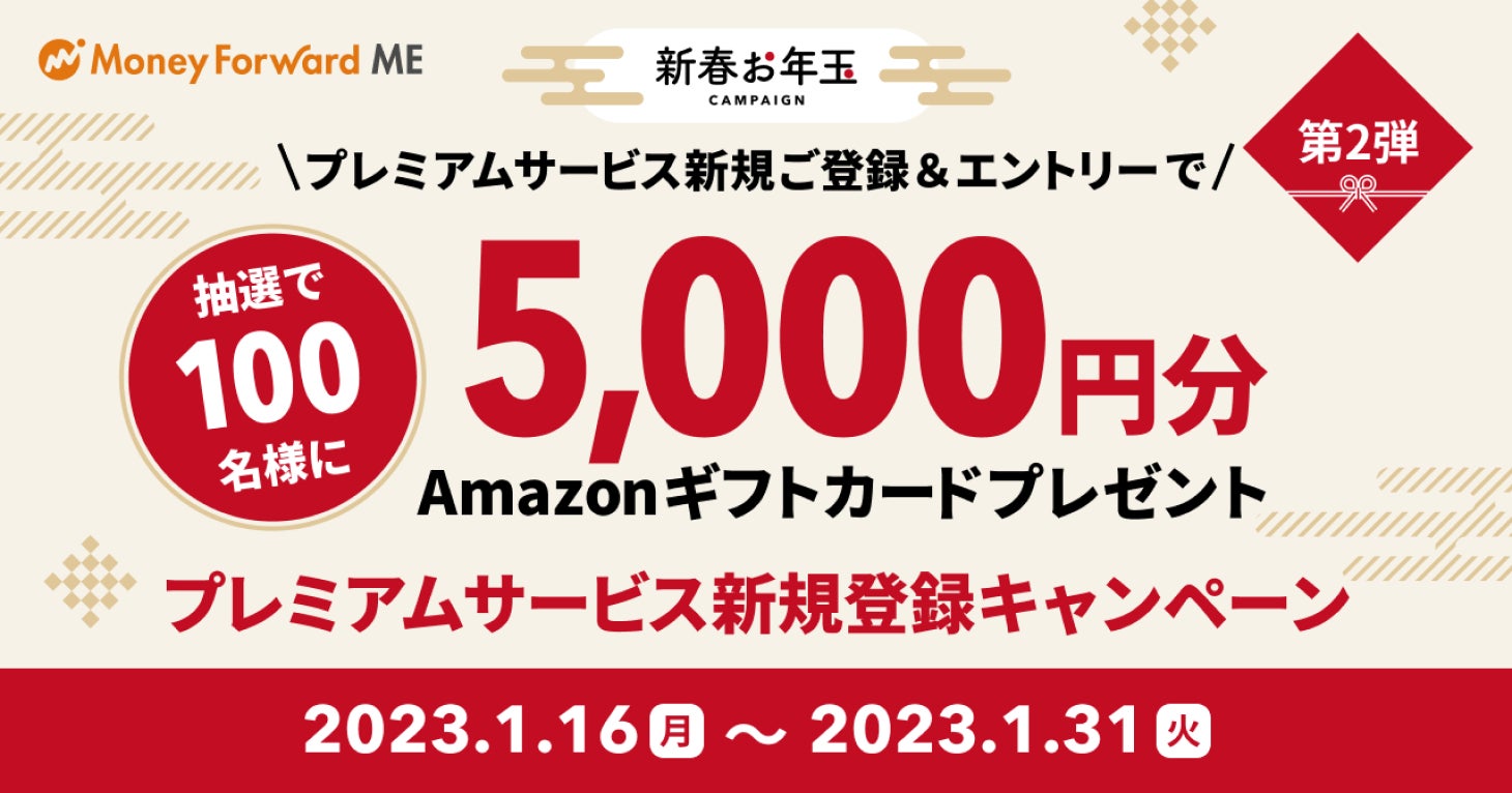 本キャンペーンは、新たな年を迎える大きな節目のタイミングで「2023年は家計管理や資産管理に挑戦してみたい」、「『マネーフォワード ME』をもっと活用していきたい」という方のスタートダッシュを応援する、年末年始のお年玉キャンペーンです。第1弾、第2弾と期間中2回開催し、それぞれ『マネーフォワード ME』へのご登録※1※2と口座連携の上エントリー、プレミアムサービスへのご登録とエントリーなど、条件クリアに応じて、抽選でAmazonギフトカード※3が当たります。