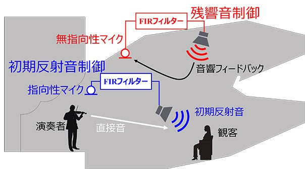 一般的に響きは、空間印象を決定づける初期反射音(ER)と響きの長さを決定する残響音(REV)で構成されます。本発明は、ER、REVそれぞれ独立のシステムを構成し、各システムには、あらかじめコンサートホールなどの実空間で測定したインパルス応答をFIRフィルタとして適用しています。ER制御では、指向性マイクで収音した直接音主体の信号に空間の印象を決定する初期反射音を合成し、客席を囲むように配置されたスピーカーから出力します。REV制御では、全指向性マイクにより収音した拡散音主体の信号に響きの長さに寄与する反射音を合成し、天井に配置されたスピーカーから会場全体に向けて出力します。さらにマイクへ戻る音響フィードバックを利用することで自然に響きを延長します。両者のバランスを制御することで、さまざまな演目に対し、空間印象や残響感が最適な音空間を創り出すことができます。