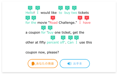 レッスン中、ネイティブスピーカーによる発音チェックに加え、最先端のAI自動採点システムを採用。発音の課題や弱点を客観的に把握し、次回に生かせる改善点を明確にすることができます。