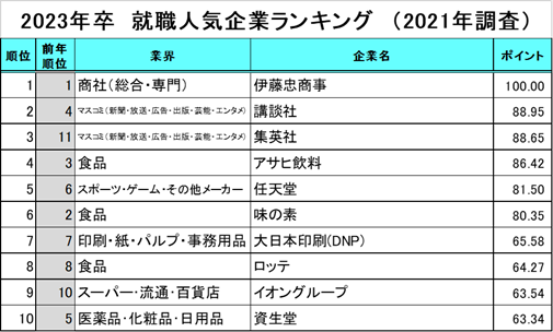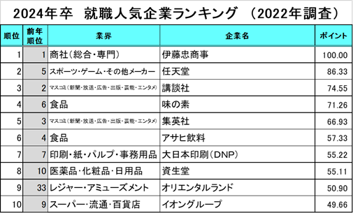 トップは、2020年調査から2022年調査まで一貫して、伊藤忠商事となっています。伊藤忠商事は、2018年調査から5年連続で首位の座を獲得。5年連続トップは2001年以降で初めての快挙となっており、人気の高さが伺えます。