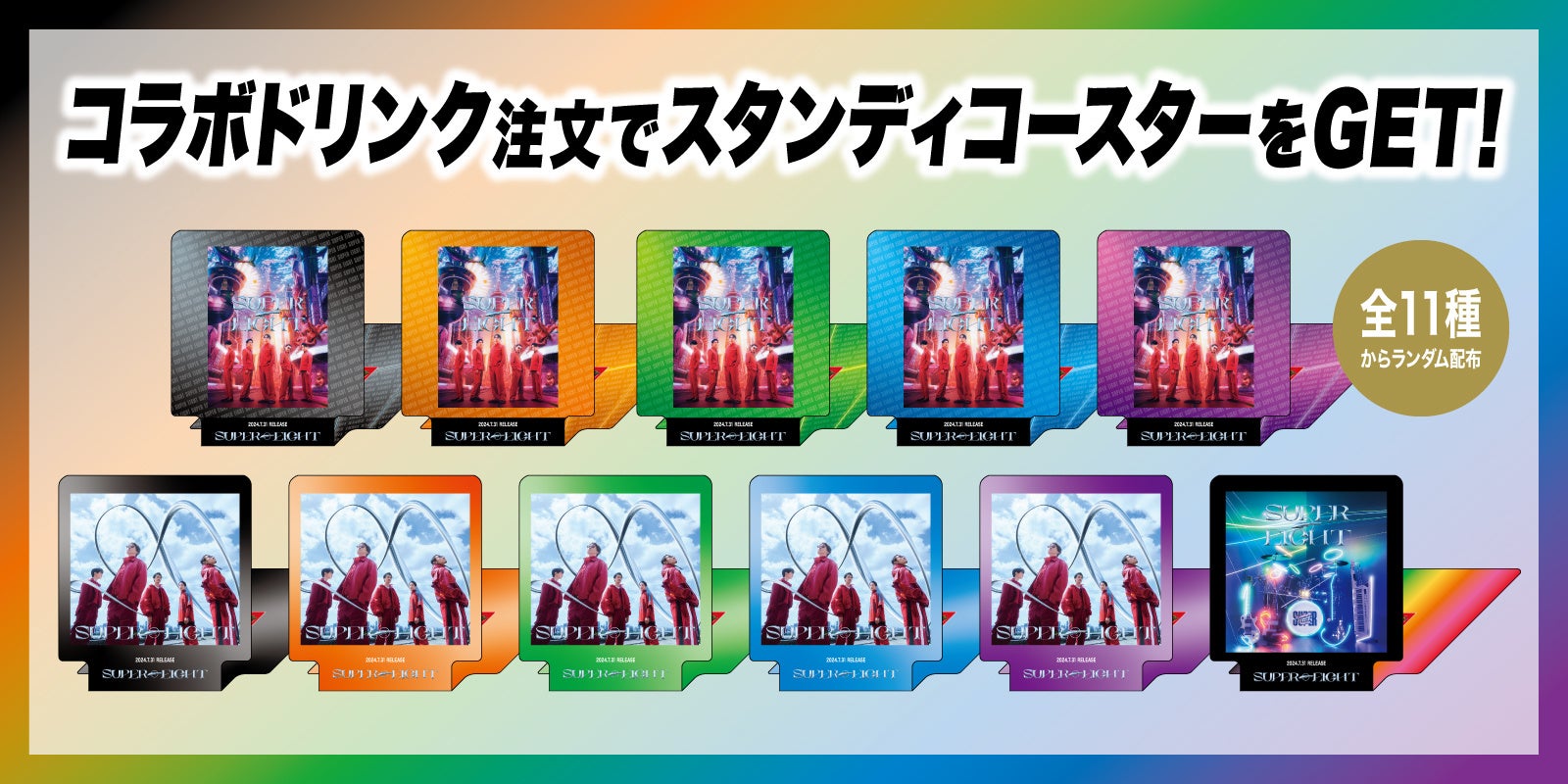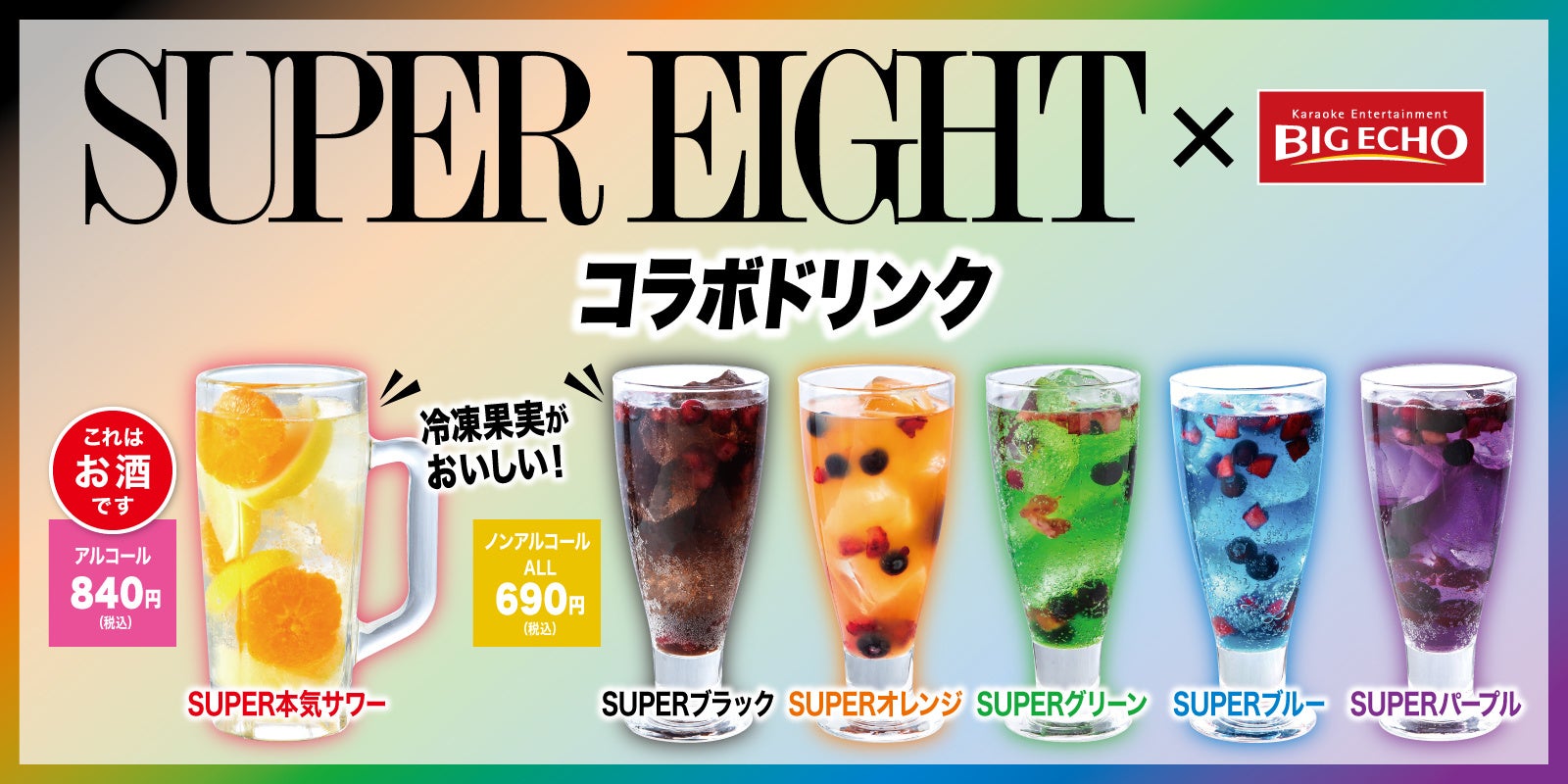 ビッグエコーおよびメガビッグ88店舗にて、SUPER EIGHTをイメージしたオリジナルドリンク6種を販売。「SUPERコラボドリンク」として、アルコール1種、ソフトドリンク5種をラインアップ。ドリンク1杯の注文ごとに、オリジナルスタンディコースター(11種)をランダムでプレゼント。
