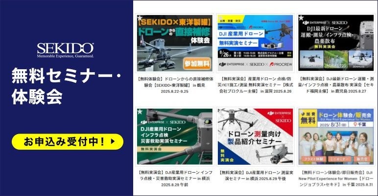 セキドでは、より多くの事業者の方にドローンを使った業務効率の改善を実現していただくため、業務用ドローンや関連ソリューションをご紹介する無料セミナーやイベントを定期的に開催しております。今後もオンラインや全国各地での開催を予定しておりますので、ご興味をお持ちのイベントにはぜひお気軽にご参加ください。