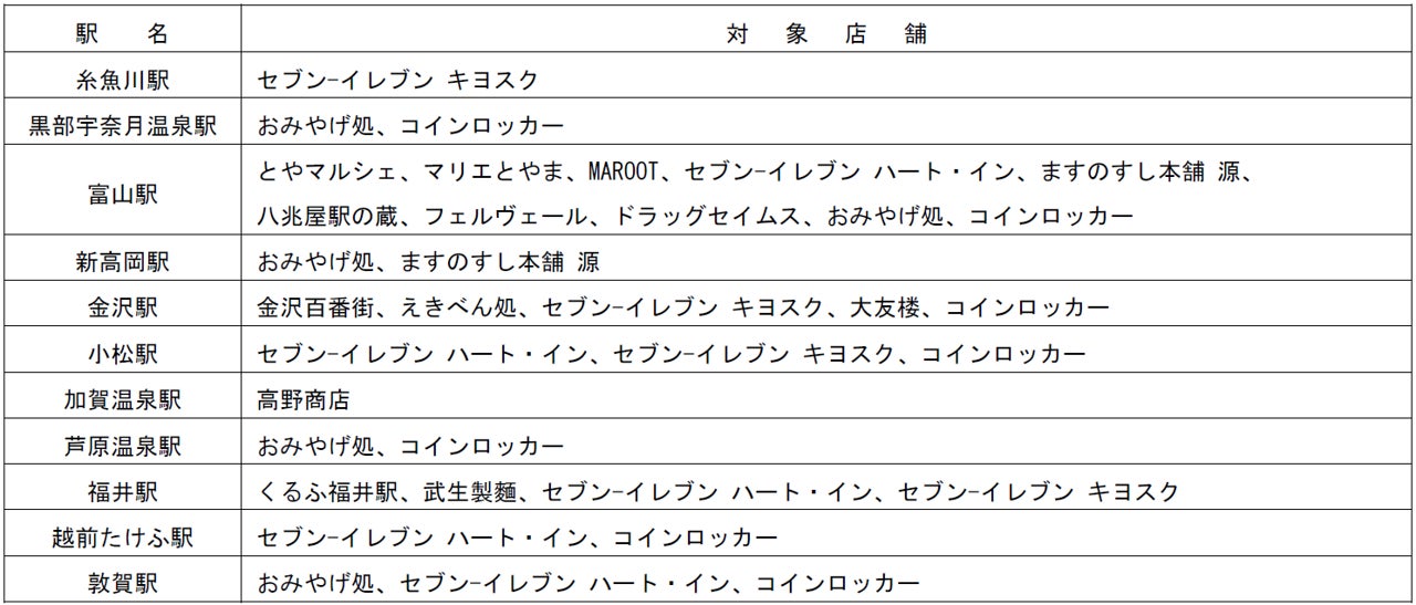 北陸新幹線の糸魚川駅から敦賀駅の駅ナカ店舗が対象です。