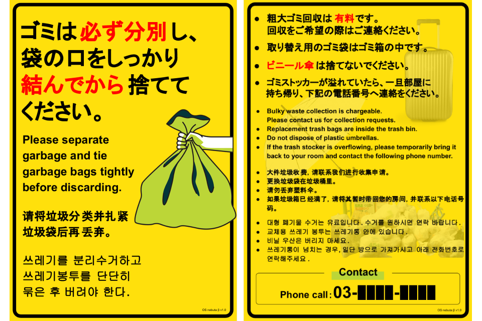 私たちが考えるゴミトラブル、騒音の一番の要因は、ゲストとのコミュニケーション不足です。訪日客はもちろん国内客であっても、ゴミの分別は地域によってルールが異なりますので、POP等を活用した周知やオペレーションの改善をしてきました。また、騒音については個別事由が多いため、個別の注意や騒音検知器の活用で対応しております。