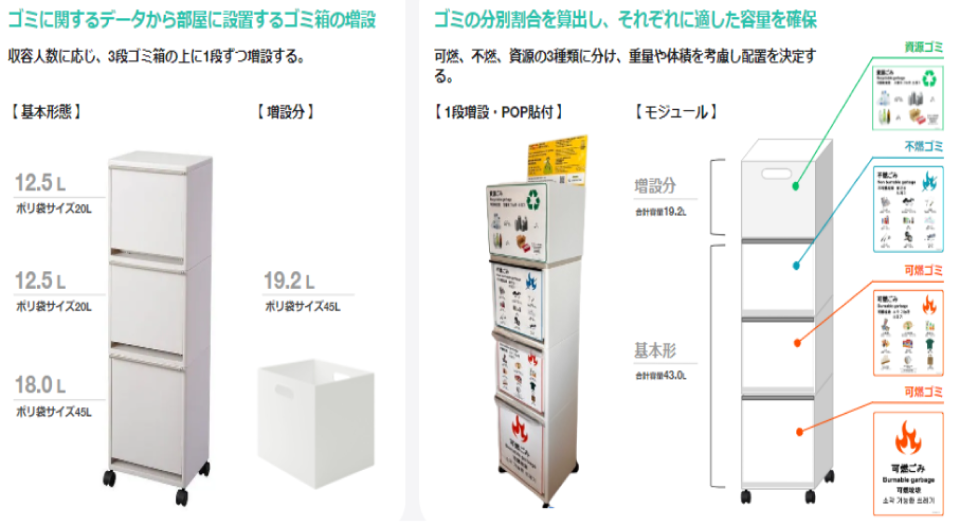 また、従来のゴミ箱より余裕のある大きさにしているため、ゴミ箱が溢れにくくなったこと、ゴミをゴミストッカーまで運ぶ頻度が減ることによりゲストも低ストレスで滞在できます。