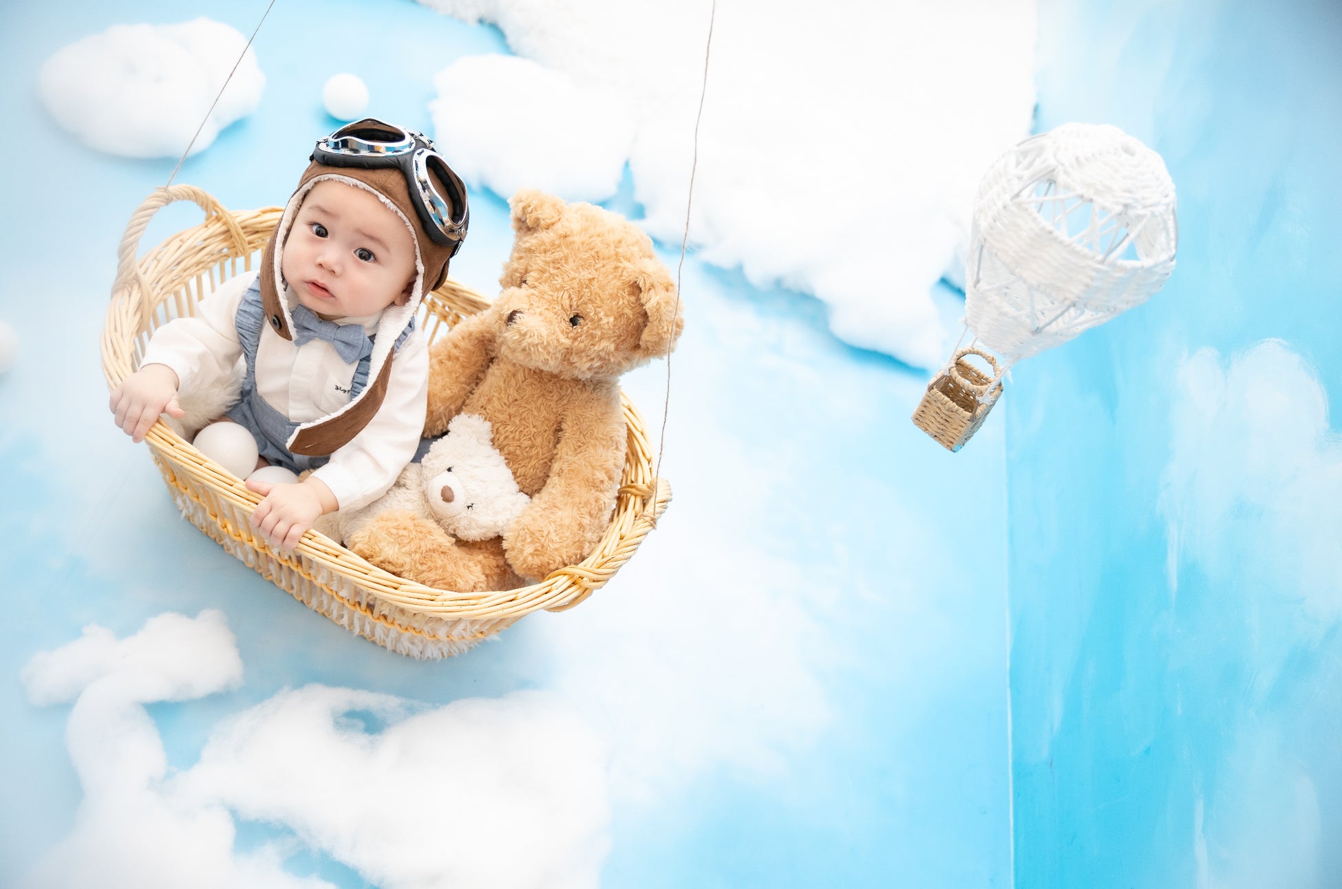 気球を操縦しながら仲良しのくまさんと一緒に空の旅へいっているかの様な爽快感がとてもおすすめで可愛い新スタイル!カゴが苦手なお子様も気球から降りて雲の上で遊んでいるところも撮影できるのもポイント。