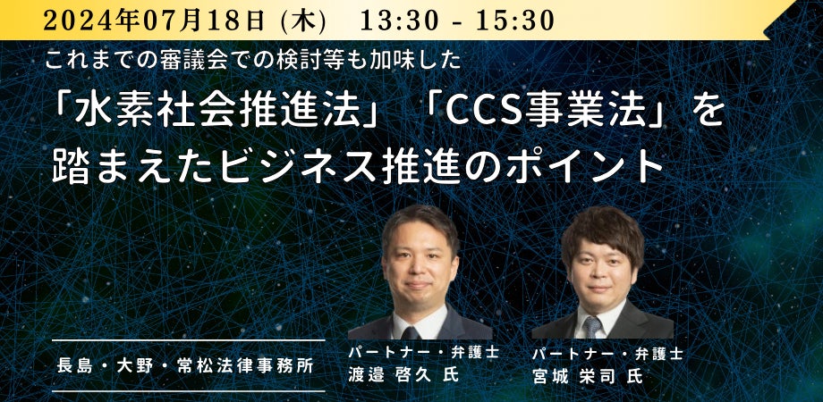 JPI(日本計画研究所)は、長島・大野・常松法律事務所 パートナー・弁護士 渡邉 啓久 氏、パートナー・弁護士 宮城 栄司 氏を招聘し、水素・アンモニアビジネス及びCCS事業について詳説いただくセミナーを開催します。