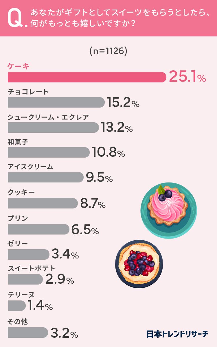 25.1%の方が、ギフトとしてスイーツをもらうとしたら「ケーキ」がもっとも嬉しいと回答しています。