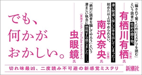 本作ではYouTuberやマッチングアプリ、精子提供、リモート飲み、など「現代的なテーマやガジェット」がふんだんに取り込まれています。現代的なテーマにミステリを織り交ぜたかつてない読み味は、まさに新世代ミステリの幕明けを予感させます。今だからこそ、そして、「当事者」のひとりである結城さんの世代だからこそ書けたといえる、批評性に富んだ作品です。