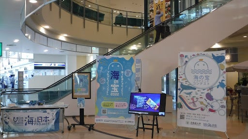 函館空港1F中央ホールで「海の宝アカデミックコンテスト2021」優秀作品の電子紙芝居(スライド)を動画放映することで、空港利用者に海の宝アカデミックコンテストのPR展示を行うとともに「海」の魅力と課題を発信しました。