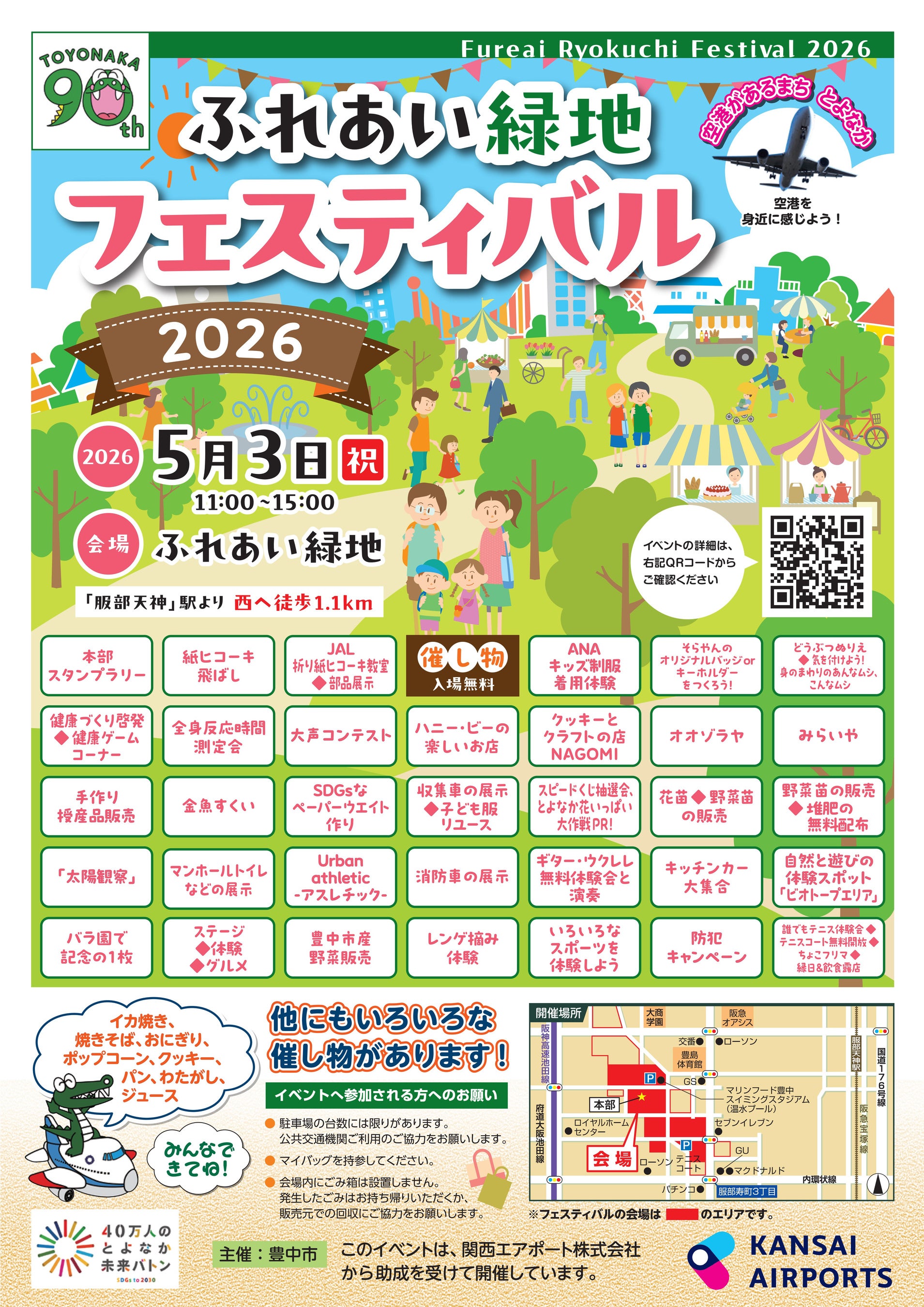 豊中市は、ゴールデンウィーク中の5月3日(祝)にふれあい緑地(服部西町)で、恒例イベント「ふれあい緑地フェスティバル2026」を開催します。