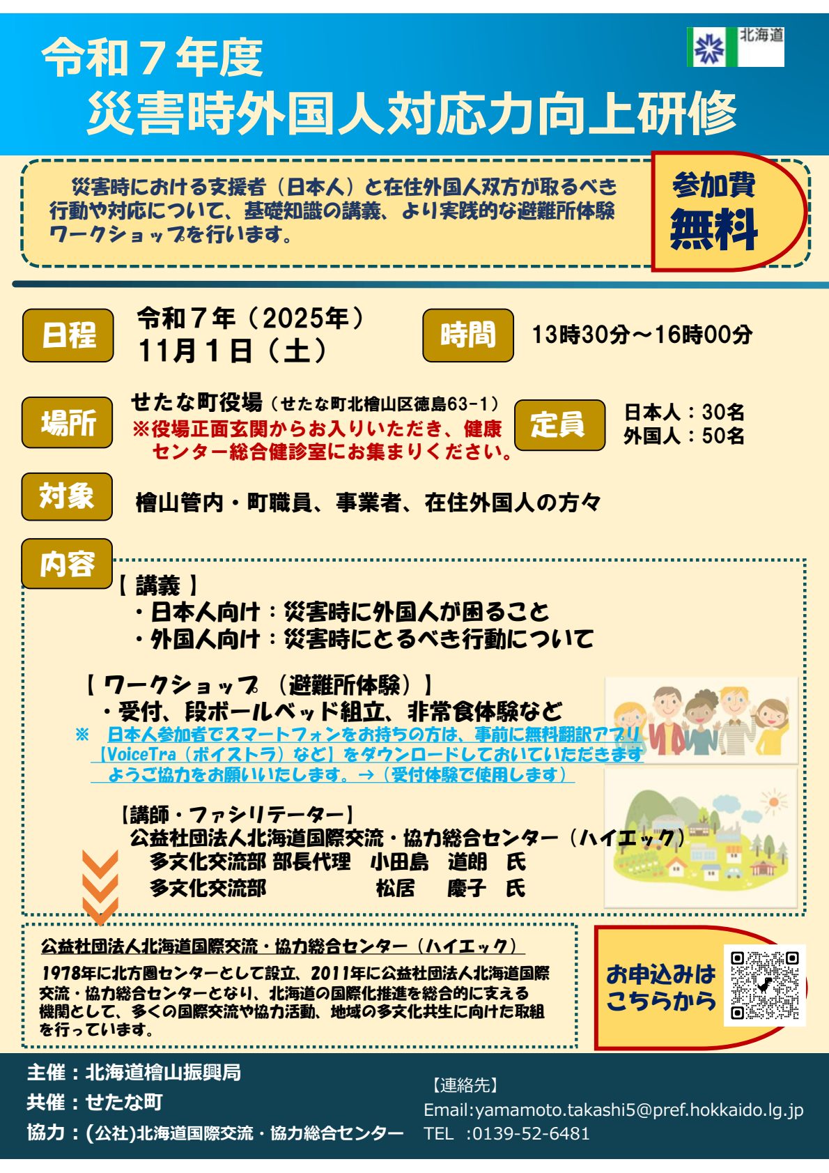 災害時に支援者(日本人)・外国人双方が取るべき行動や対応についての講義、実際の避難所受付を体験するワークショップを行うなど、多文化共生の醸成を図るための研修を開催します。