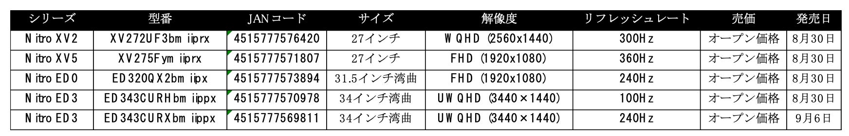 日本エイサー株式会社(本社:東京都新宿区、代表取締役社長:ボブ・セン)は、ゲーミングモニターブランド Nitroより、新たに27インチ360hzから34インチ100Hzウルトラワイドまでのゲーミングモニター、「XV272UF3bmiiprx」「XV275Fymiiprx」「ED320QX2bmiipx」「ED343CURHbmiippx」の計4機種をAmazonから本日8月30日、「ED343CURXbmiippx」を9月6日より発売します。
