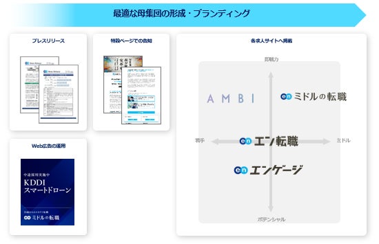 プレスリリースや特設ページ、Web広告での告知に加え、各求人サイトでの集客支援を実施。『エン転職』『エンゲージ』『AMBI』『ミドルの転職』とターゲットの異なる求人サイトを活用することで、ターゲットへ網羅的に求人を届けます。