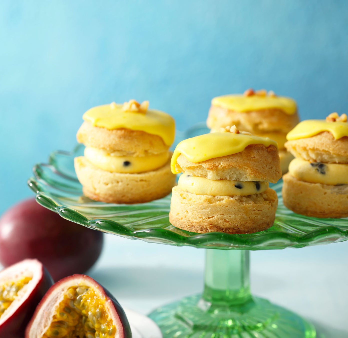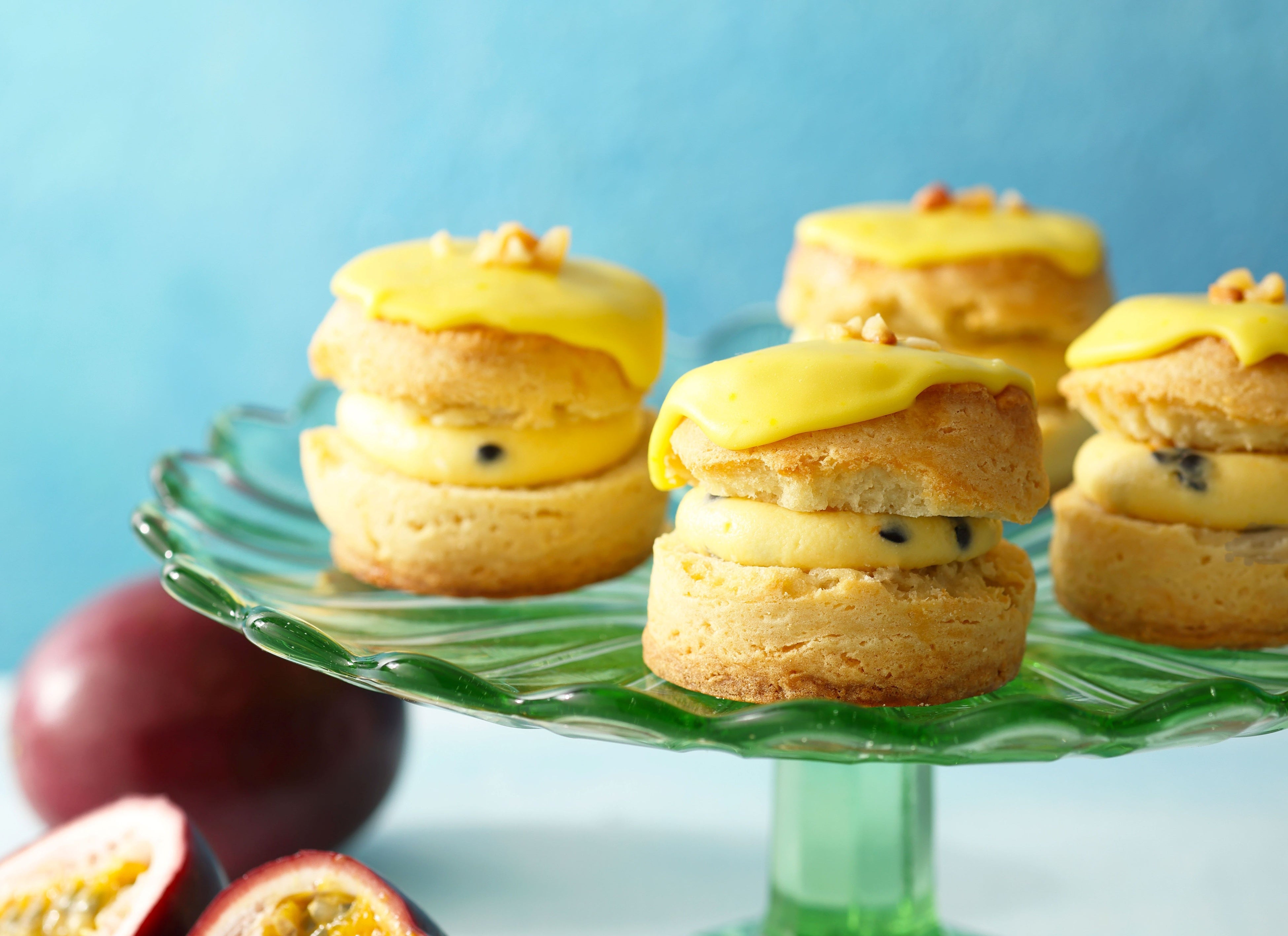 バターミルクスコーンに南国気分広がる爽やかな酸味のリリコイクリームチーズをサンド。パッションフルーツのアイシングで仕上げました。