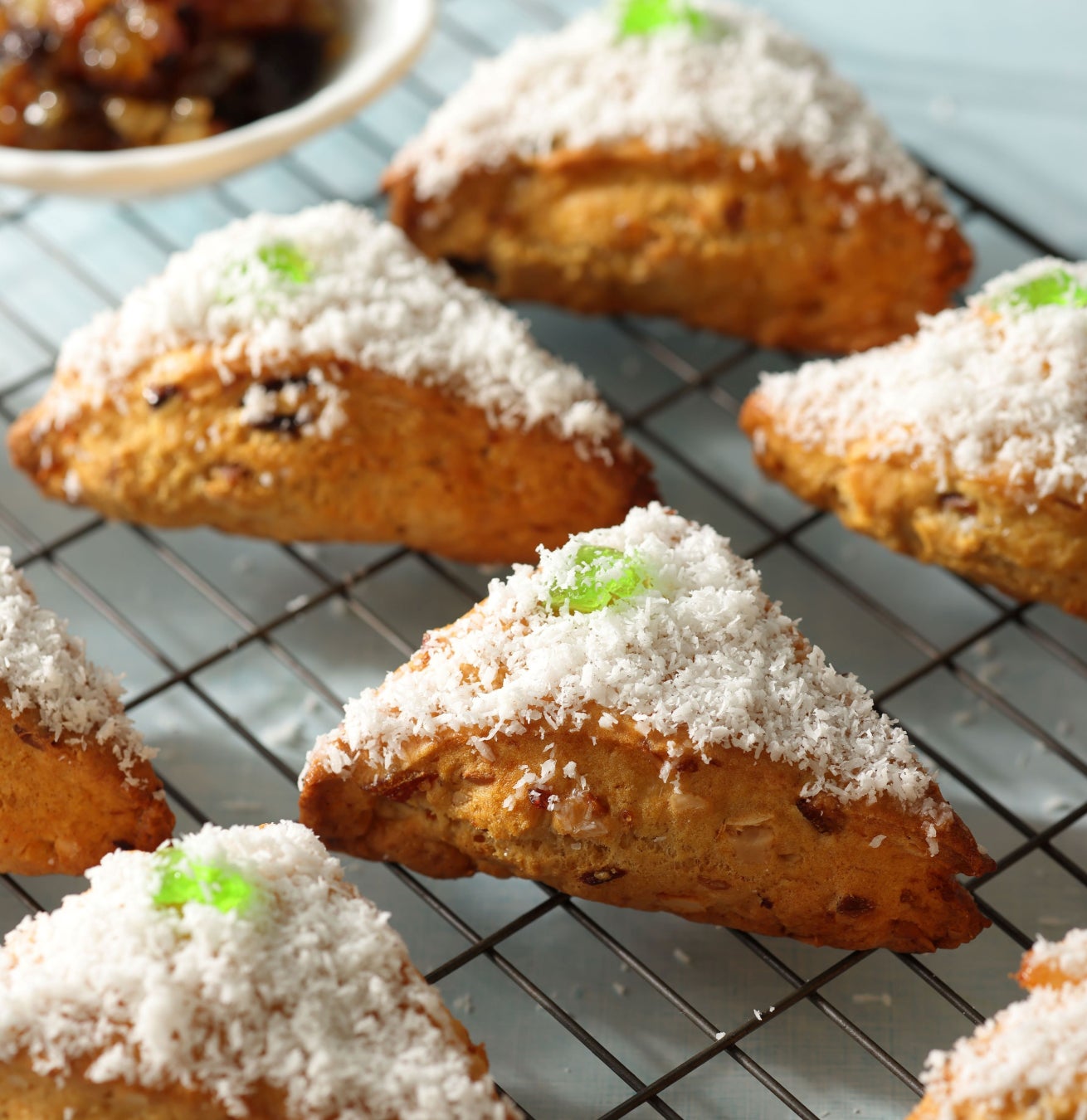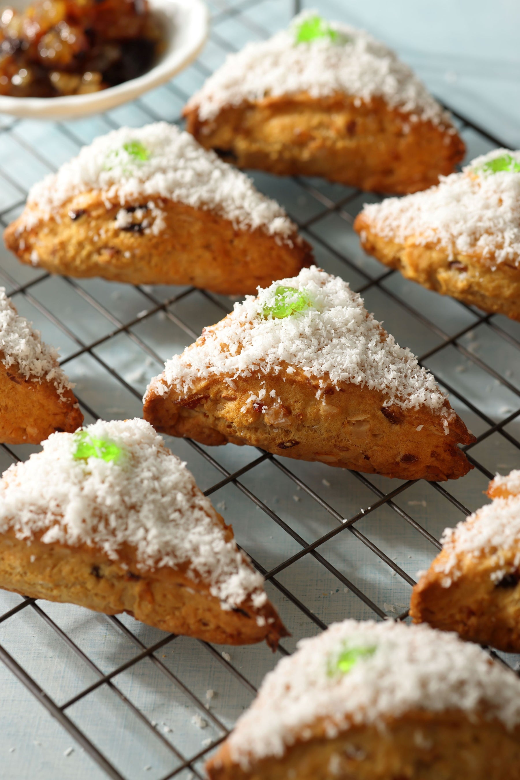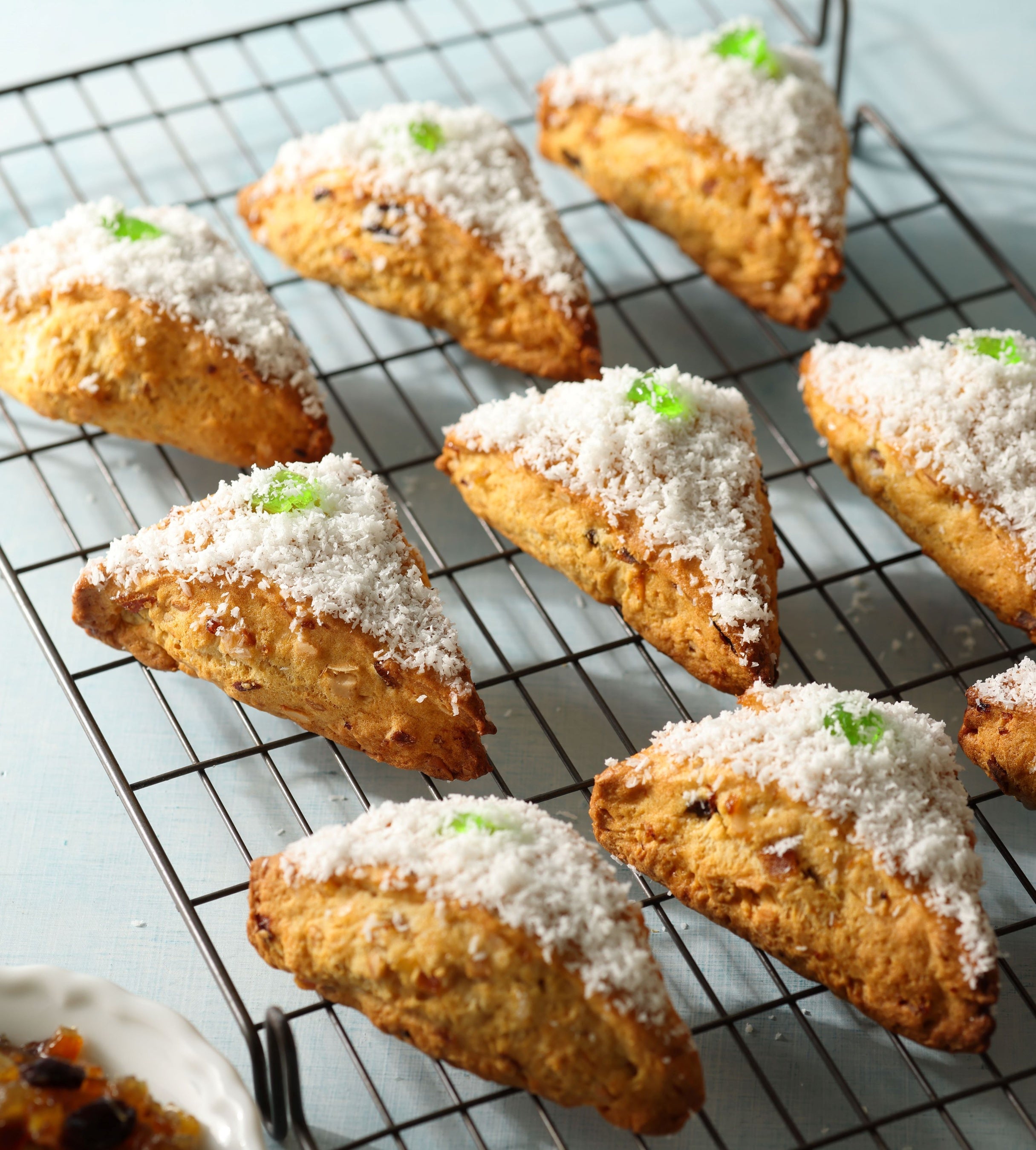レモンやパイナップルなどドライフルーツ5種とココナッツミルクを加えた夏のフルーティーなスコーンにココナッツファインをたっぷりトッピング。