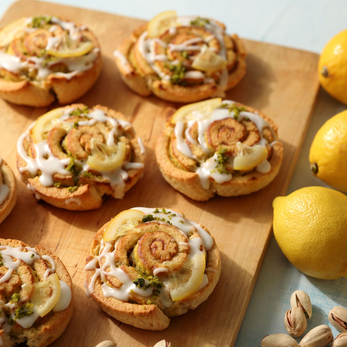 ピスタチオカスタードをスコーン生地で巻いて焼き上げ、仕上げに甘酸っぱいレモンアイシングをかけた爽やかな味わいのスコーン。東京ギフトパレット5周年記念限定商品。