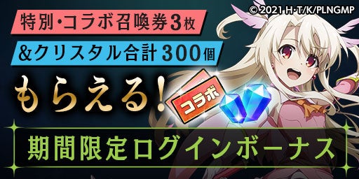 ログインボーナス1日目では『プリズマ☆イリヤ』のキャラクターが手に入る可能性のある「特別・コラボ召喚券」がもらえ、さらにクリスタルが手に入るコラボ特別ミッション、コラボ限定キャラクターが手に入るコラボイベントの開催など、盛りだくさんな内容となっております。
