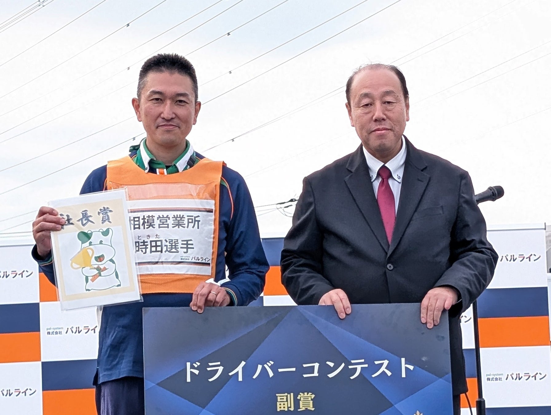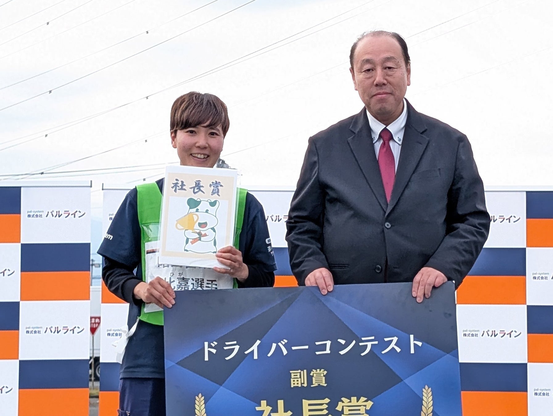 個人でも、最優秀となる社長賞を同センター比嘉麻衣理さんが生活物流部門で、基幹物流部門は相模営業所の時田新一さんが受賞しました。表彰状と副賞を手渡した横山社長は「競って終わりにするのではなく、安全運転の技術を事業所で広めてください」と期待しました。