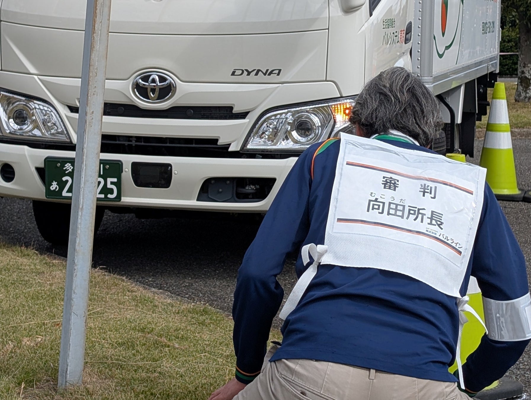 競技は「走行競技」と「タコつぼ競技」を実施しました。走行競技は、スラローム走行や駐車を想定したコースを接触や乗り上げがないように走行し、安全性と正確性を審判が採点します。タコつぼ競技は、タコつぼ型のスペースへ侵入してトラックを脱出するまでの時間を競い、トーナメント形式で行われました。