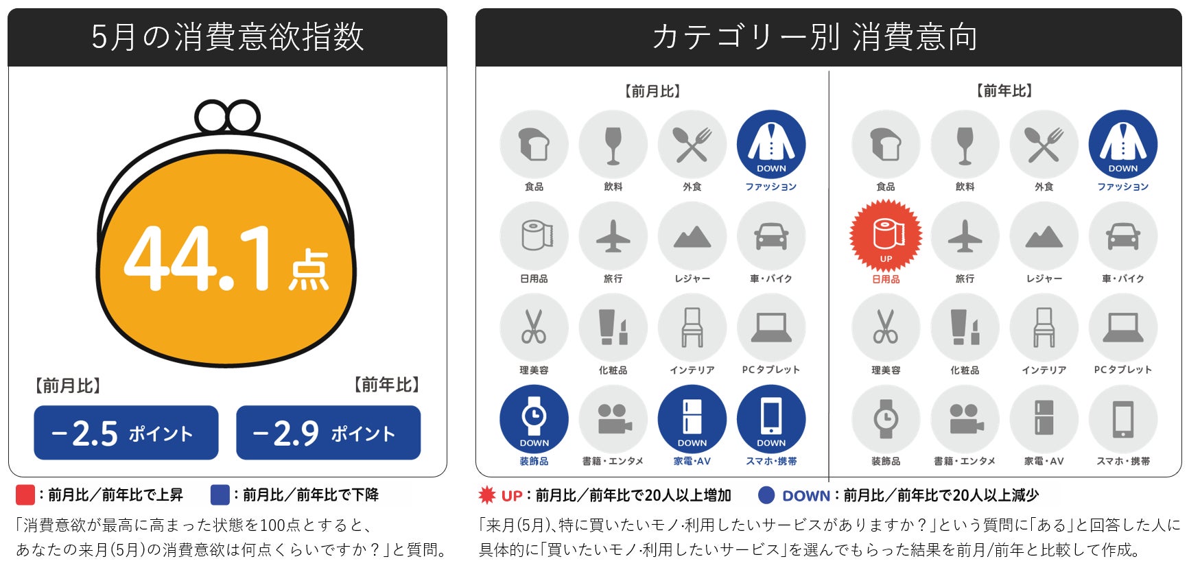 2025年5月の消費意欲指数は44.1点。前月比で-2.5pt、前年比でも-2.9ptと、ともに低下しました。