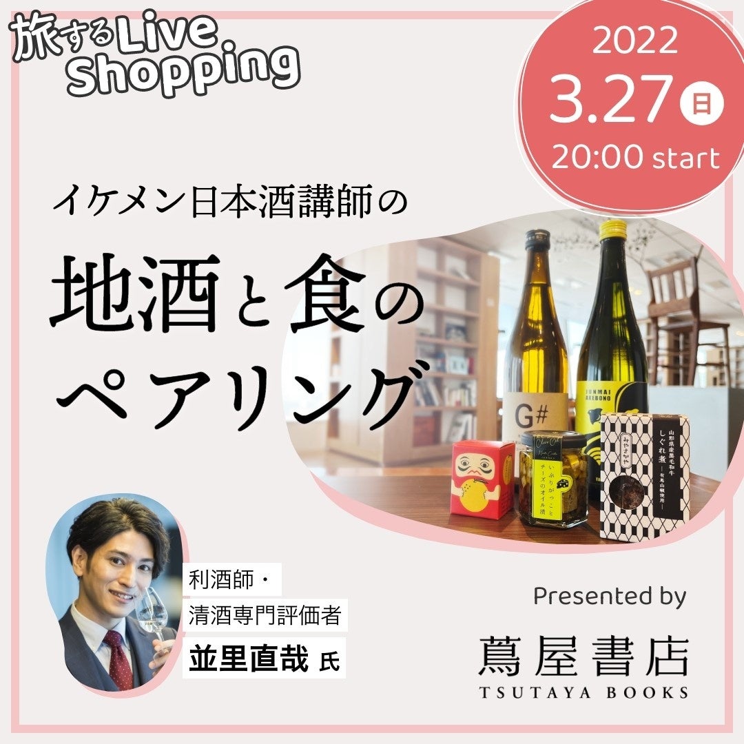 蔦屋書店が厳選する地酒と食を、イケメン日本酒講師が最高の組み合わせで紹介。ライブコマースイベント「イケメン日本酒講師の地酒と食のペアリング~旅するLiveShopping~」を2022年3⽉27⽇(日)20:00より開催します。
