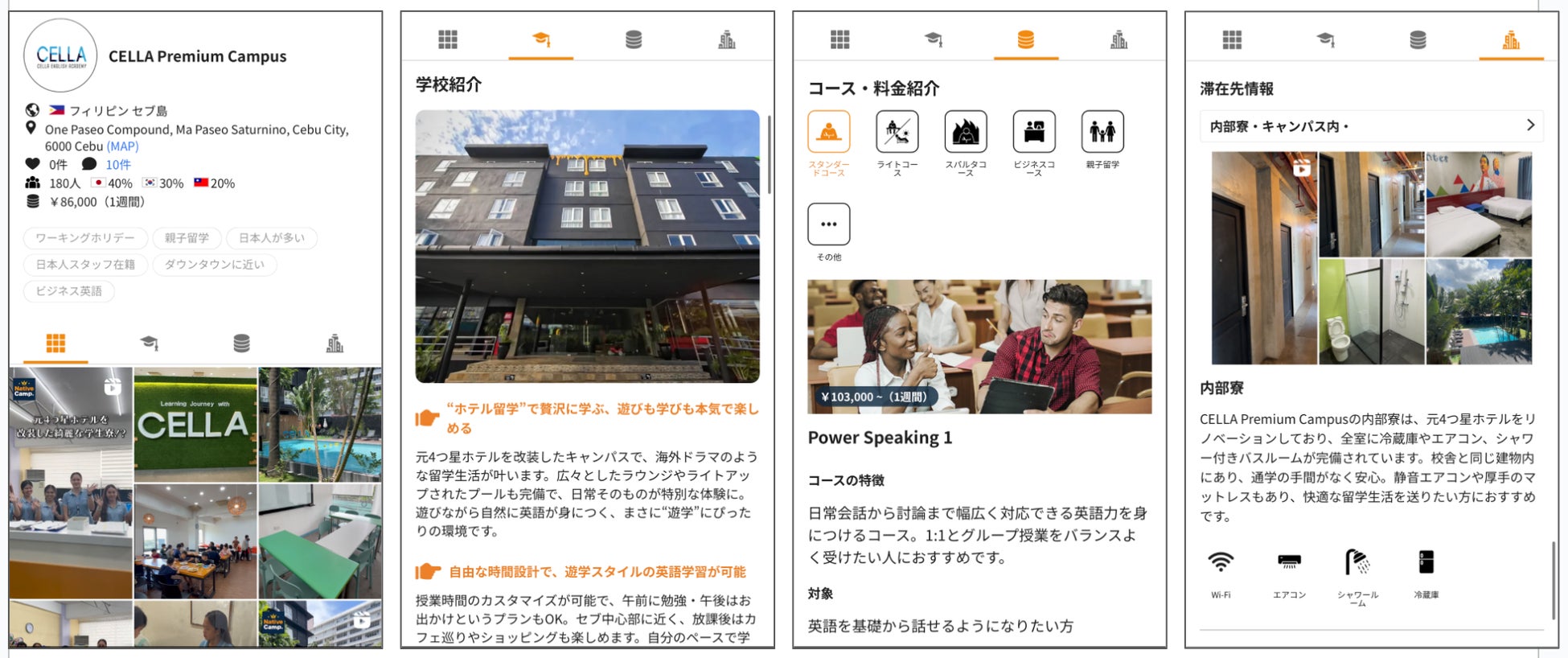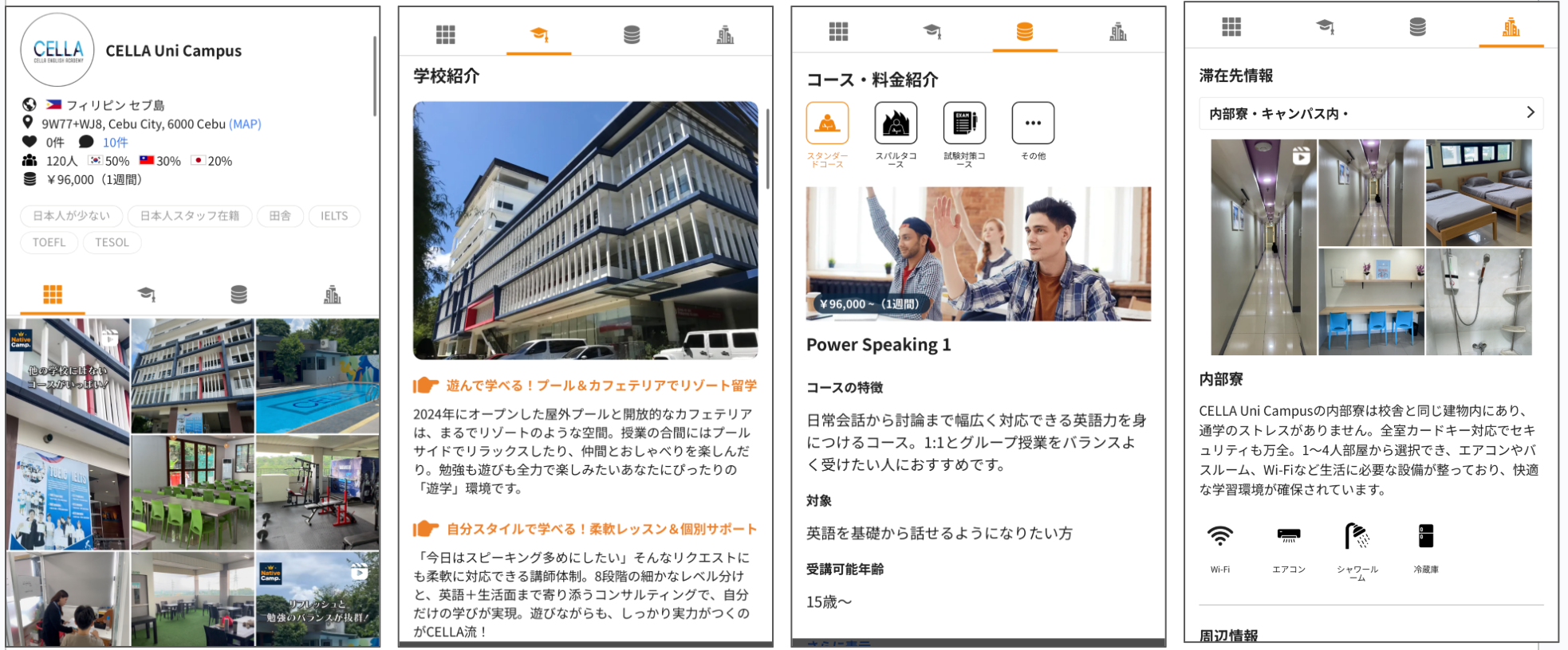 ネイティブキャンプ留学では、ユーザーが必要な情報を分かりやすく把握できるよう、常に丁寧で明確な情報提供を心がけています。CELLAの詳細情報は、以下の4つのカテゴリーに分けて掲載しており、知りたい情報を的確にお届けします。
