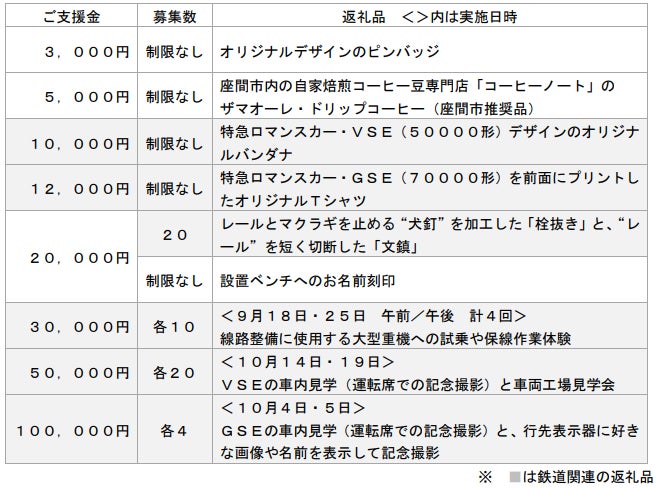 なお、支援ご返礼品は金額に応じて、設置するベンチへの名前刻印のほか、特急ロマンスカー・VSE(50000形)の運転席での記念撮影や、主に夜間活躍する大型保線重機への試乗など、当社ならではの体験型コンテンツを多数ご用意します。