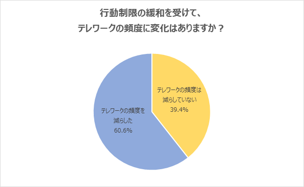 行動制限の緩和を受けて、「テレワークの頻度を減らした」と回答した企業が60.6%に上りました。「テレワークだけでは業務に支障があるので、出社の機会も設けている」「ブレストや会議は出社して実施している」「業務に合わせて生産性の高い働き方を選択するようにしている」「職種によって、頻度を調整している」といった声が寄せられました。