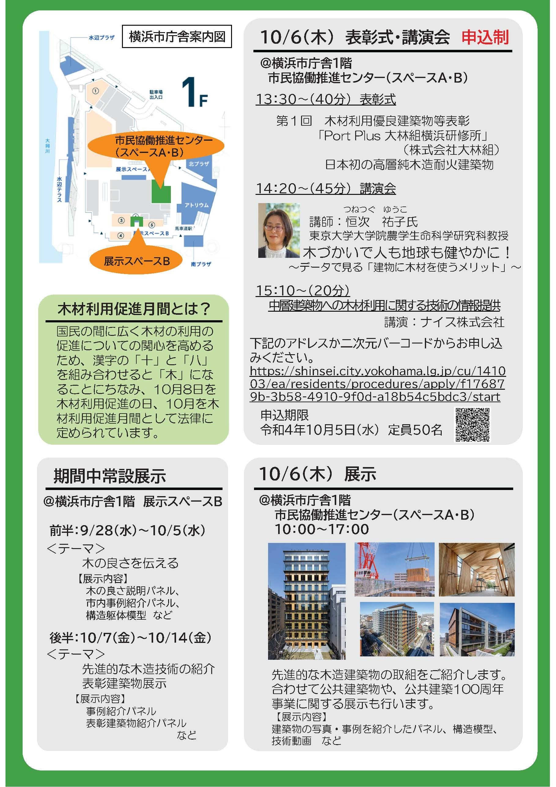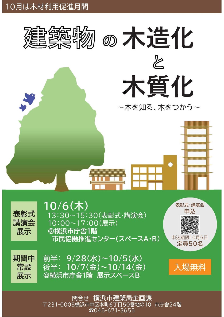 横浜市木材利用イベント『建築物の木造化・木質化~木を知る、木をつかう~』を10月6日に開催!木材利用の効果や先進的技術について情報発信します!