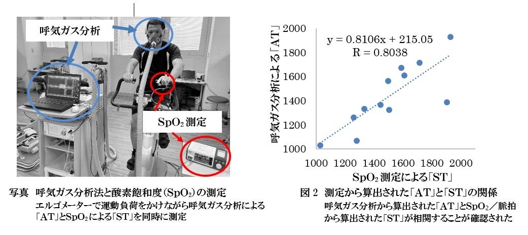 健常な成人12人を対象とし、エルゴメーター※6で運動負荷をかけながら、「AT」は呼気ガス分析を用い、「ST」はパルスオキシメーター※7を用い、「AT」と「ST」の判定に必要なデータを同時に測定しました(写真)。その結果、「ST」は「AT」と相関することが確認されました(図2)。この結果から、「SpO2」と「脈拍」の測定により算出した「ST」が、「AT」の代用にできることを見いだし、特殊な機器や設備、または採血が必要であった「AT」を、「SpO2」と「脈拍」の測定により簡便かつ正確に算出できる方法として確認しました。