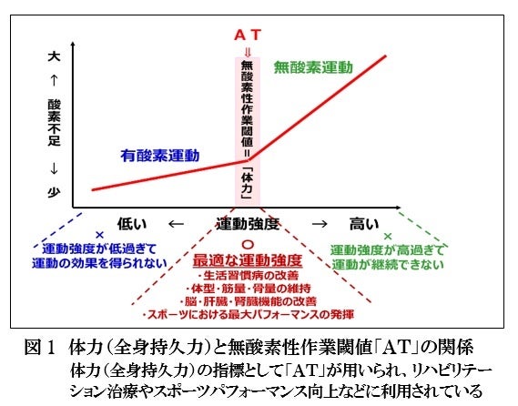 「AT」は軽い運動から徐々に運動負荷(=運動強度)を高めて行った際に「有酸素運動」から「無酸素運動」に切り替わり始める転換点であり、個人の「体力」の指標となります。またAT時点で運動することは、その個人に合った最適な運動強度となるため、リハビリテーション治療などの医療分野やスポーツ分野において効率的な体力づくりに応用されています(図1)。