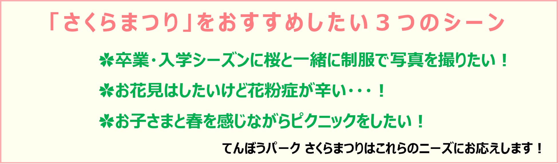 そこで、お客様の様子からわかった、屋内施設「てんぼうパーク」のさくらまつりならではの、3つのおすすめご利用シーンをご紹介します!