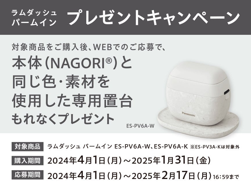 2024年4月1日~2025年1月31日の期間中に対象商品をご購入の上、WEBからご応募いただいたお客様全員に、ラムダッシュ パームイン本体と同様の素材を使ったNAGORI®製専用置台をもれなくプレゼントいたします。