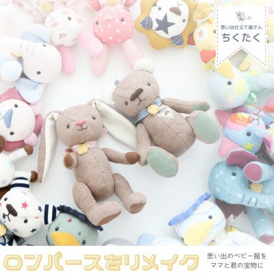 お子さんが着ていたロンパースを、かわいいぬいぐるみにリメイクすることができるお礼品です。