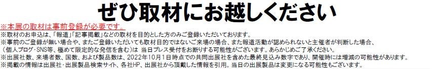 ※記載の出展社数・製品数・国数は、同時開催展を含む2022年9月30日時点での最終見込み数字であり、開催時には増減の可能性があります。
