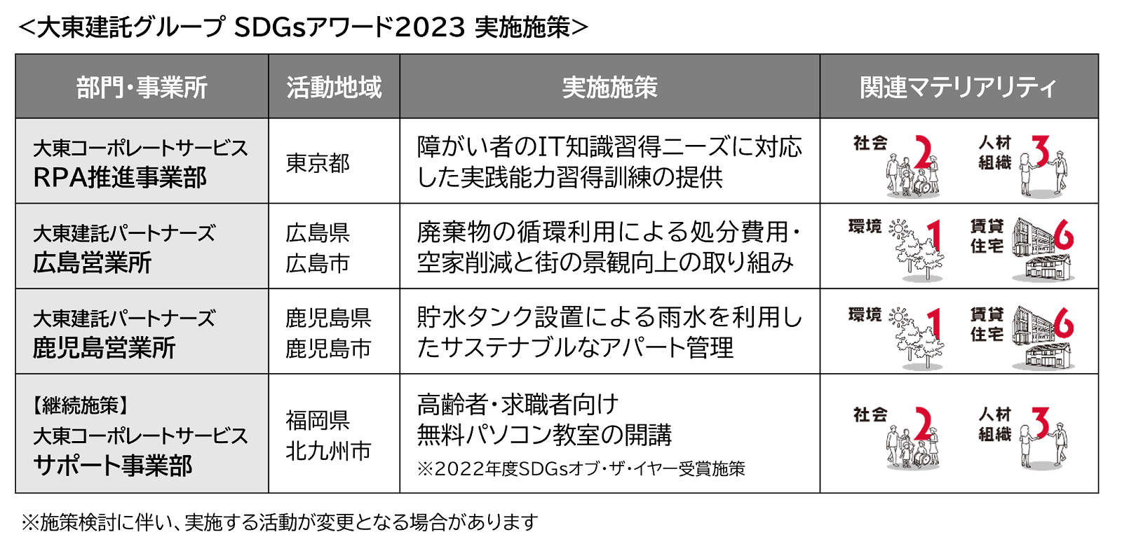●「大東建託グループ SDGsアワード2023」実施4施策(新規3施策、継続1施策)が決定