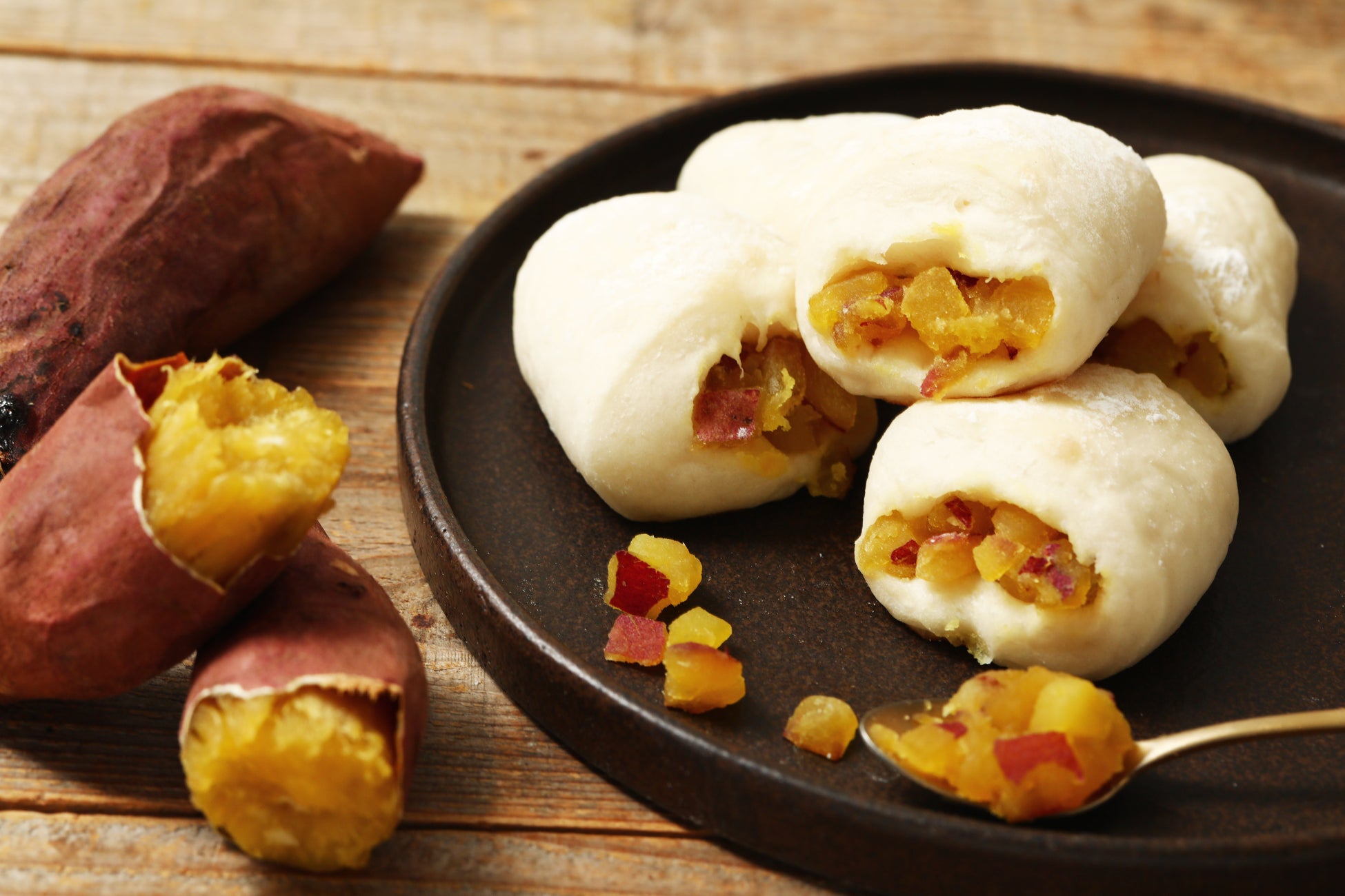 と金時」のさつまいもを包んで焼き上げました。米粉由来の優しい甘みが広がる生地に、さ