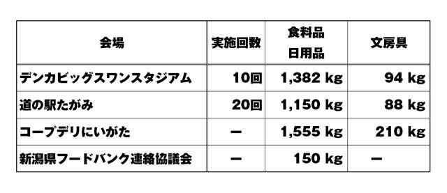 また、2023年3月から12月まで、道の駅たがみ(田上町)とホームゲーム会場で全30回実施したフードドライブでお預かりしました寄付の総重量は、4,629kgに達しました。活動にご協力いただいた皆様、本当にありがとうございました。
