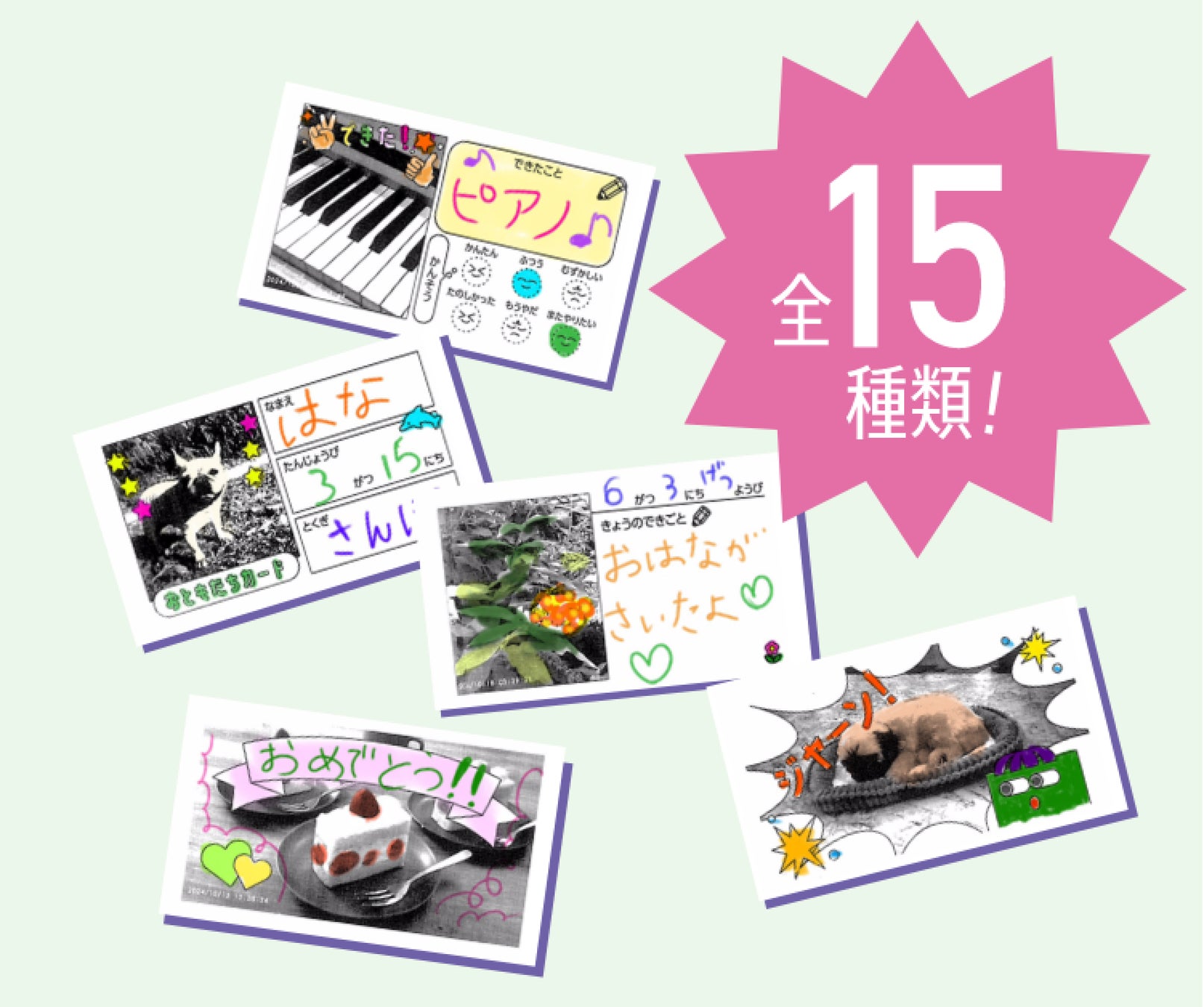 写真日記が作れるフレーム、できたことや好きなものをコレクションするフレーム、メッセージを書き込めるフレーム、塗り絵ができるフレームなど、子どもが進んで撮影したくなるようなオリジナルフレームが全15種類入っています。