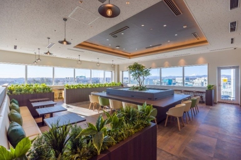 建物全体では、1階を茶系として、エントランスの壁面のデザインから「萌芽の地表面」を、施設内のルーバーや壁面の色合いから「森の小道」を表現し、上層階の緑系へとアイキャッチの色彩をグラデーションさせ、4階を「山頂」をモチーフとすることによって、登山をするかのような高揚感を演出しております。また、4階のラウンジでは、室内や付属するバルコニー・テラスから富士山の眺望を楽しむことができます。加えて、当該地の特徴でもある、敷地の約2割を占める森林をイメージして、自然素材や光などを活用したバイオフィリック・デザインを取り入れることにより、「BIOPHILIC LOGISTICS CENTER」にふさわしい、ワーカーがくつろぐことができる働きやすい空間づくりを構成しております。