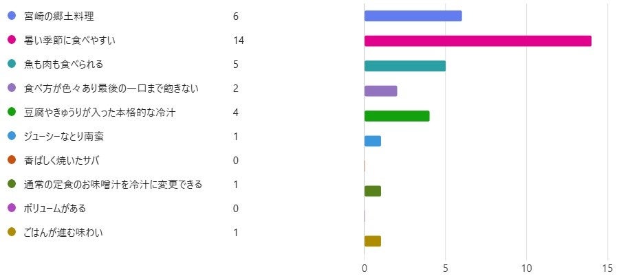 最も多くの票を集めたのは『暑い季節に食べやすい』というポイントでした。2位は『宮崎の郷土料理』、3位は『魚も肉も食べられる』でした。冷たい味噌だしをかけてさらりと味わう“冷汁”に、やわらかくジューシーなとり南蛮。南国・宮崎の食文化を一つの定食で楽しめる、夏にぴったりの一品です。