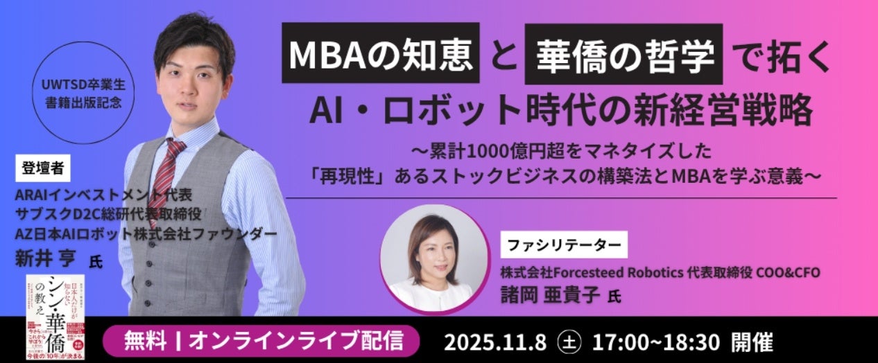 本セミナーでは、ウェールズ大学 トリニティセントデイビッド (UWTSD) でMBAを取得し、中国で体得した「華僑のビジネス哲学」と融合させることで、サブスクリプション事業で累計1000億円以上のマネタイズ実績を持つ新井亨氏をお迎えします。
