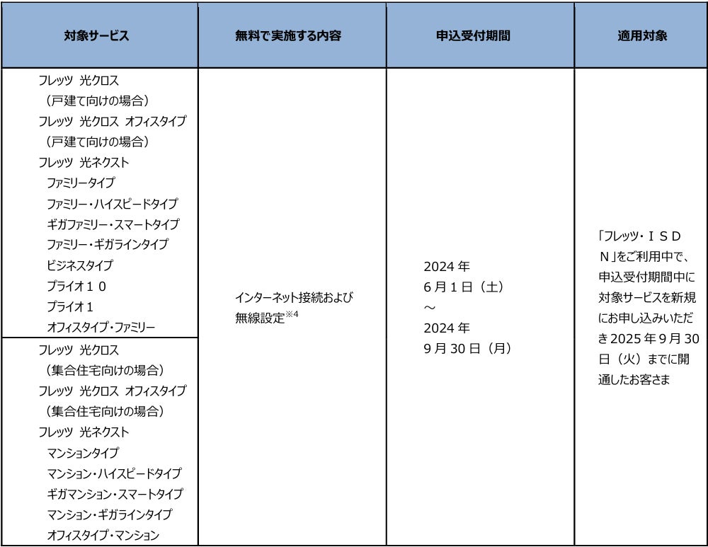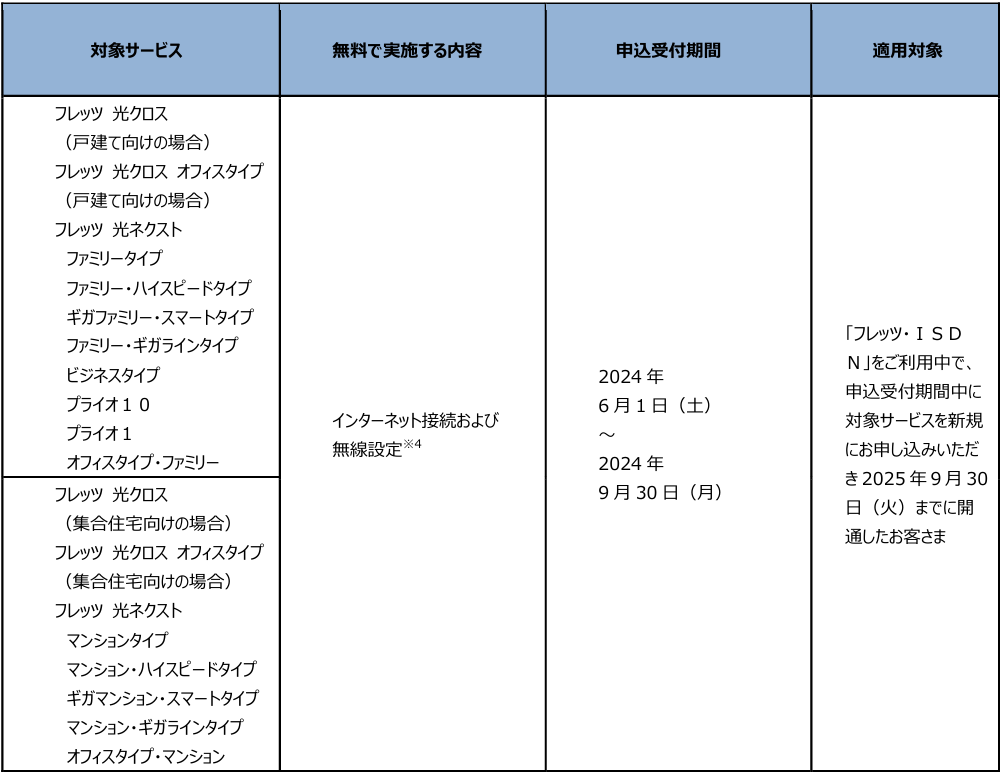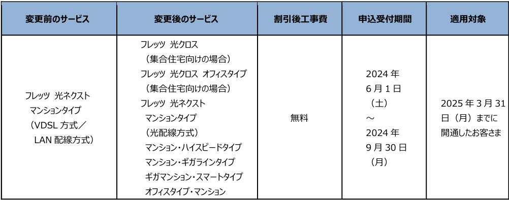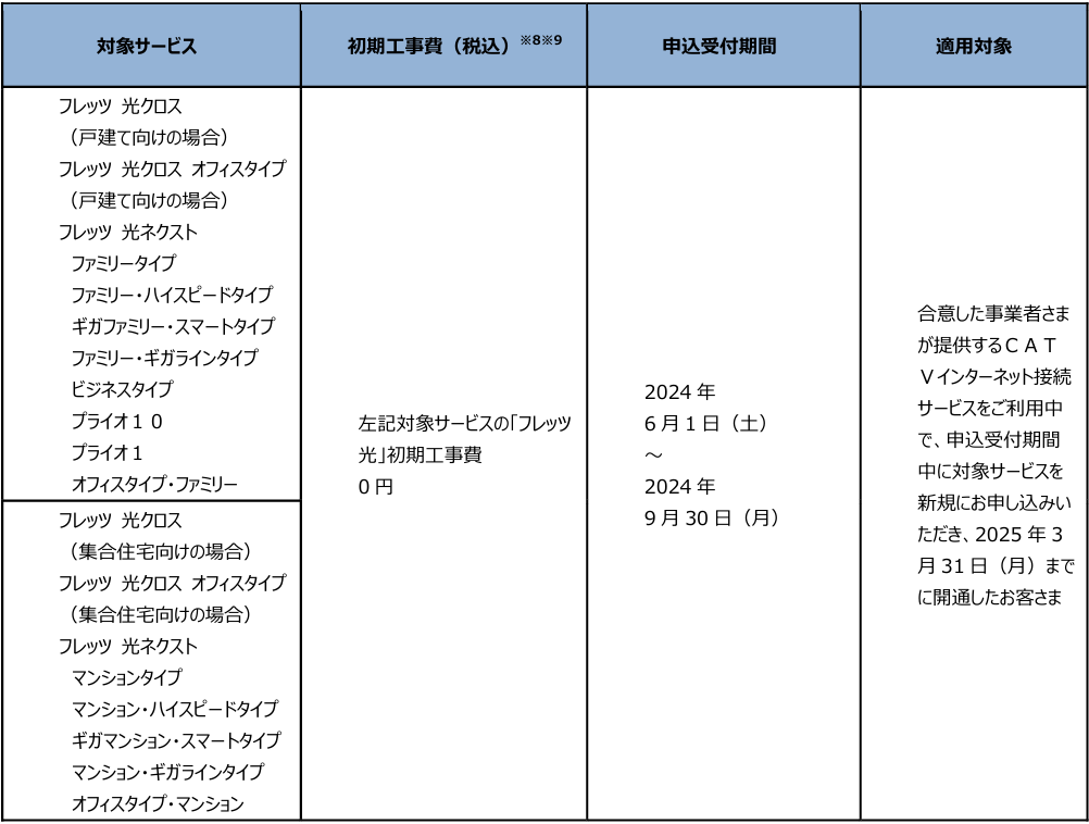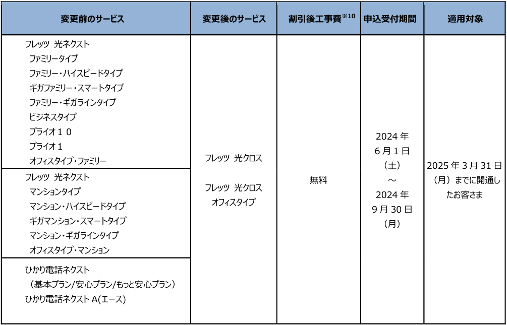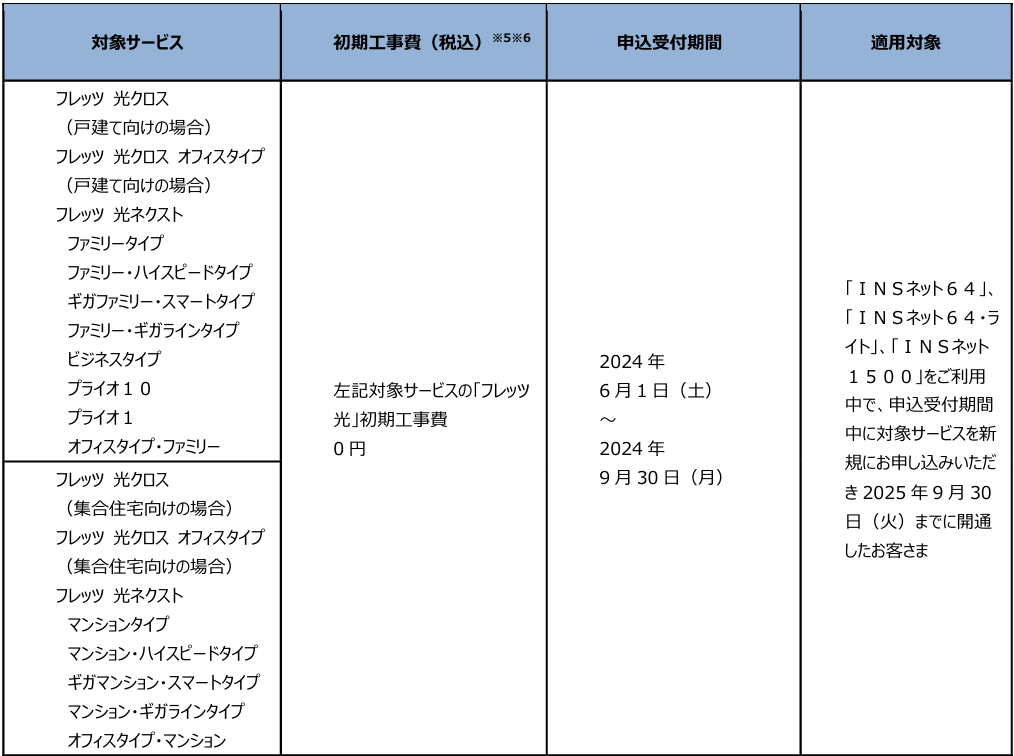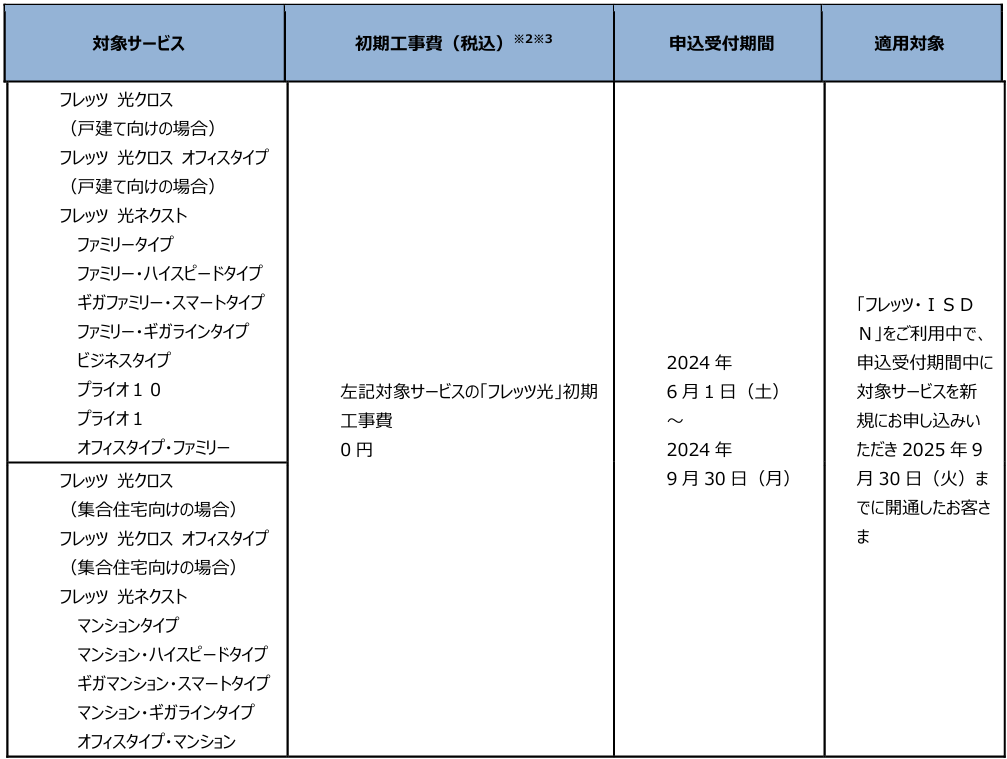 (1)「フレッツ・ISDN」、「INSネット64」、「INSネット64・ライト」、「INSネット1500」、「『フレッツ光』初期工事費を無料とすることに合意した事業者さまが提供するCATVインターネット接続サービス」※1より「フレッツ 光クロス」、「フレッツ 光ネクスト」へ移行する場合の工事費等の無料
