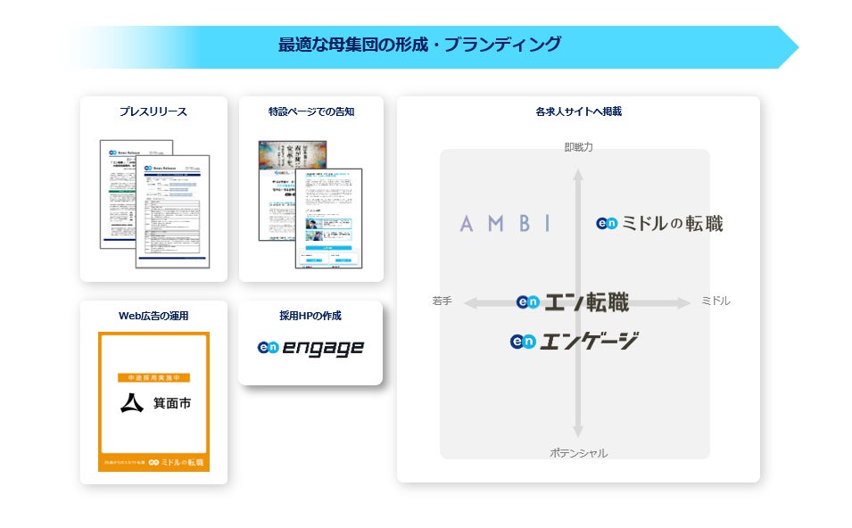 プレスリリースや特設ページ、『engage』を用いた採用HPの作成、Web広告での告知に加え、各求人サイトでの集客サポートを実施いたします。『エン転職』『エンゲージ』『AMBI』『ミドルの転職』とターゲットの異なる4つの求人サイトを活用することで、ターゲットへ網羅的に求人を届けます。